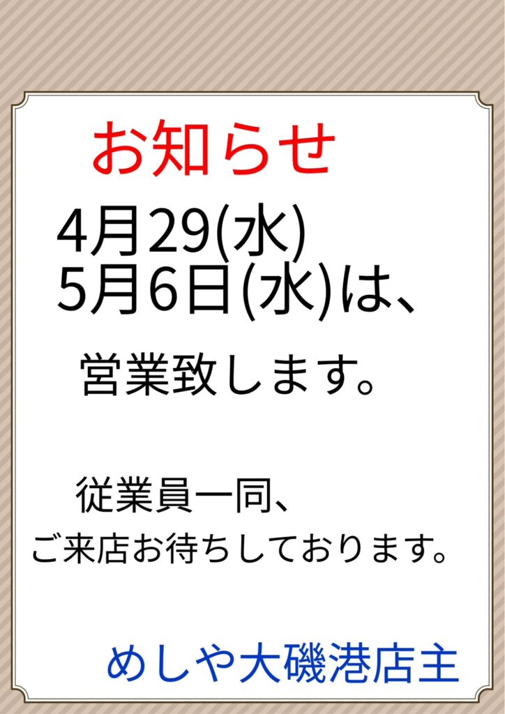 ゴールデンウィークの営業時ついて